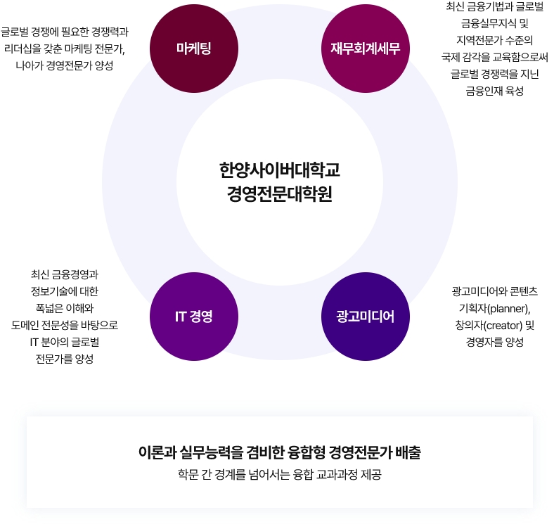 본 이미지는 한양사이버대학교 경영전문대학원의 세부 트랙 구성을 원형 구조로 설명한다.